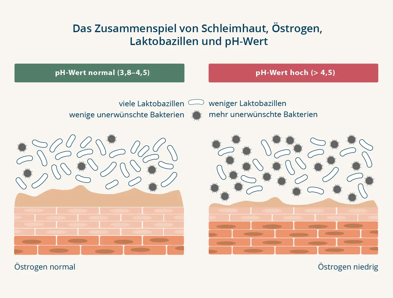 Die wichtigste Energiequelle für Laktobazillen ist Glykogen, das unter dem Einfluss des Hormons Östrogen in der Vaginalschleimhaut gebildet wird. Mit sinkendem Östrogenspiegel nimmt die Glykogenproduktion ab. Die Folge: weniger Laktobazillen, weniger Milchsäure. Damit steigt auch der pH-Wert und unerwünschte Keime können sich leichter ausbreiten.