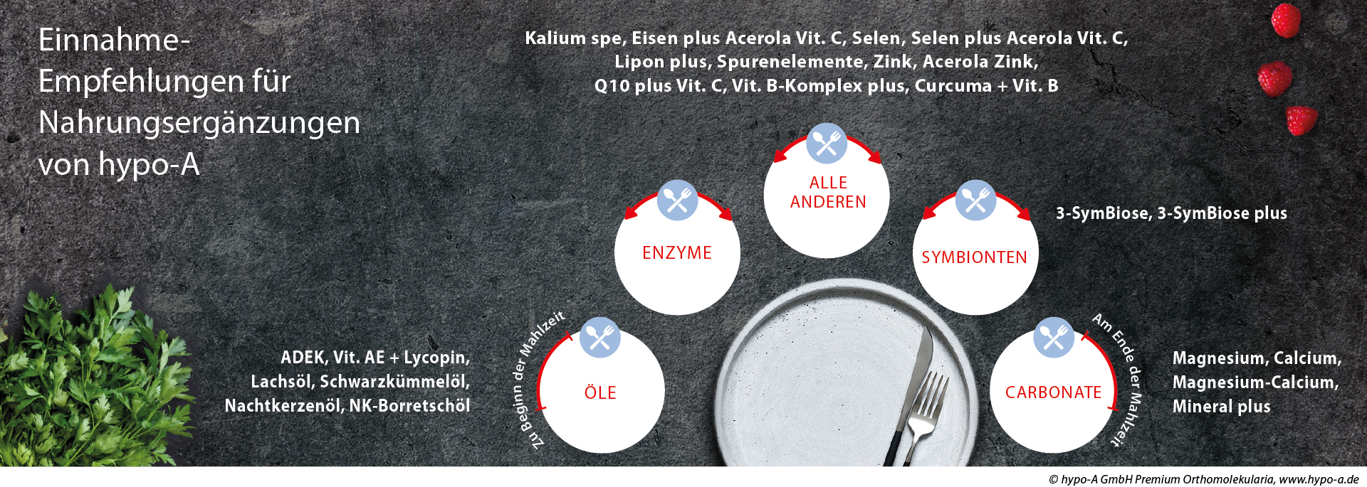 It is particularly important to separate oils and carbonates over time so that they do not react with each other and valuable fatty acids are lost. Accordingly, we recommend taking all oils before meals. This applies to ADEK, Vit. AE + Lycopene, salmon oil, black cumin oil, evening primrose oil and NK borage oil, and therefore to all oval soft gelatin capsules. All products containing carbonate (magnesium, calcium, magnesium-calcium and mineral plus) then follow at the end of the meal. For all other hypo-A dietary supplements, such as B vitamins, minerals, trace elements, enzymes and symbionts, the following applies: simply take them during a meal.