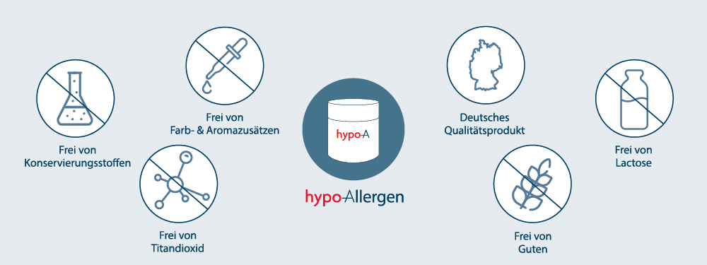 Hypoallergenic means “below the intolerance threshold”. Hypoallergenic orthomolecular therapy (hoT) uses substances that normally do not trigger allergies. The dietary supplements manufactured according to the rules of hypoallergenic orthomolecular medicine consciously avoid substances such as gluten, lactose and fructose, which often lead to intolerances. In addition, all hypo-A products for hypoallergenic orthomolecular therapy are manufactured without any synthetic or natural, undeclared auxiliary substances and additives. Hypo-A food supplements are free of flavors and colorings, but also Free of chemical manufacturing aids such as magnesium stearate, which is even widely used in naturopathic preparations. Natural dietary supplements from hypo-A, because they are designed to be strictly hypoallergenic, rarely or never cause food intolerance or allergies.Intake recommendations for our nutritional supplements