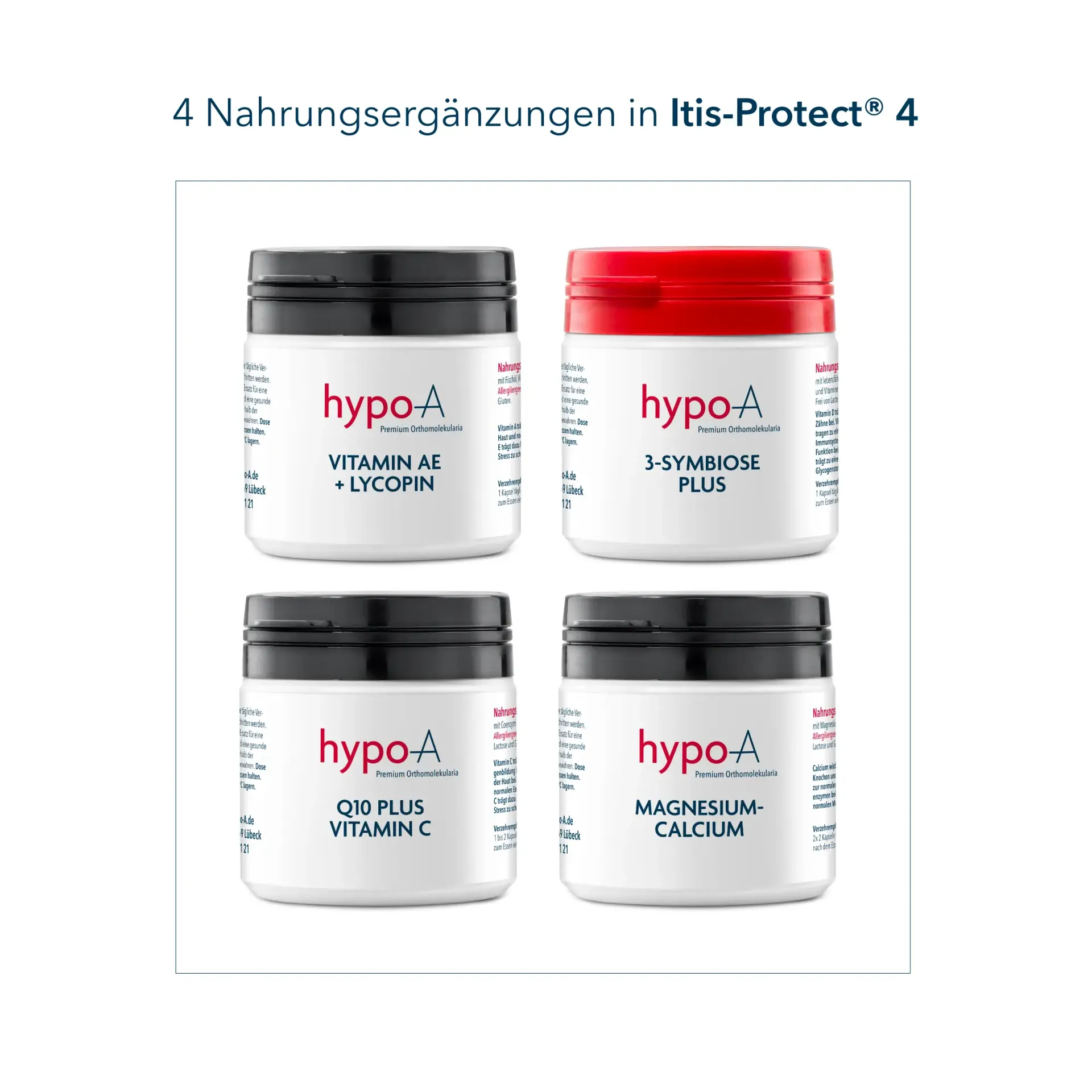 | Ingredients: | (RRR)-α-Tocopherol / Vitamin E , Bifidobacterium bifidum , Calcium , Coenzym Q10 (Ubichinon) , Cyanocobalamin / Vitamin B12 , Enterococcus faecalis (Streptococcus faecalis) , Fischöl mit EPA (Eicosapentaensäure) und DHA (Docosahexeansäure) / Omega-3 , Folsäure / Vitamin B9 , Kieselerde , Lactobacillus acidophilus , Lycopin , Magnesium , Pantothensäure / Vitamin B5 , Provitamin A / β-Carotin , Pyridoxin / Vitamin B6 , Saccharomyces cerevisiae (Hefe, inaktiv) , Vitamin C , Vitamin D3 / Cholecalciferol , hypoallergene Gelatinekapsel (Rind) , hypoallergene vegane Kapsel |