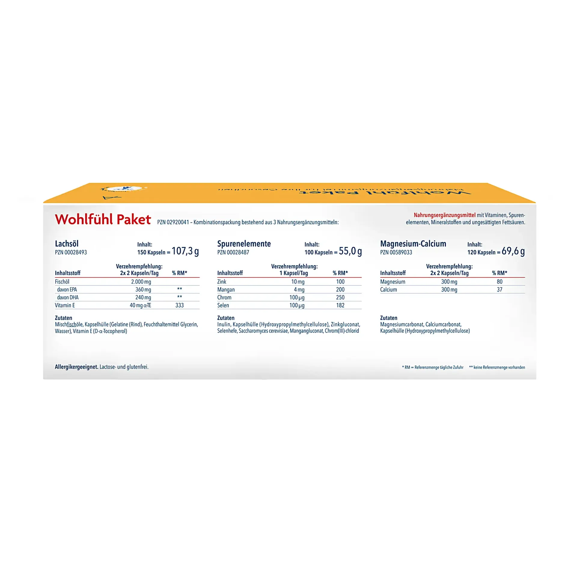 The "Feel-Good Pack" is full of well-being nutrients from salmon oil capsules, trace elements and magnesium-calcium.With cell-protecting antioxidants and micronutrients for energy balance, nerves and much more - for everyone who wants to do something good for themselves.