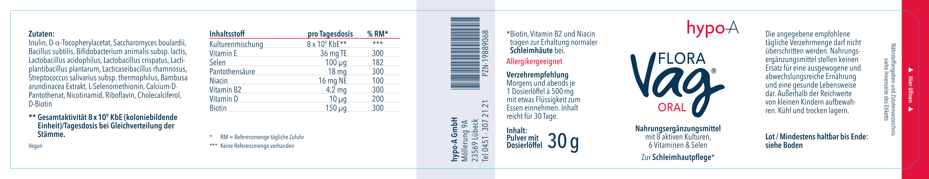 Jede Tagesportion FloraVag® Oral enthält acht Milliarden aktive Mikroorganismen aus acht verschiedenen Kulturen: sieben Bakterienkulturen – darunter die Milchsäurebakterien Lactobacillus acidophilus, L. crispatus und L. rhamnosus, die zu den typischen Vertretern der natürlichen Vaginalflora zählen, plus die Spezialhefe Saccharomyces boulardii. Hinzu kommen siliziumhaltiger Bambusextrakt sowie der lösliche Ballaststoff Inulin. Abgerundet wird die Rezeptur durch das Spurenelement Selen als Methionin mit sechs ausgewählten Vitaminen – und nutzt dabei geschickt natürliche Synergien: